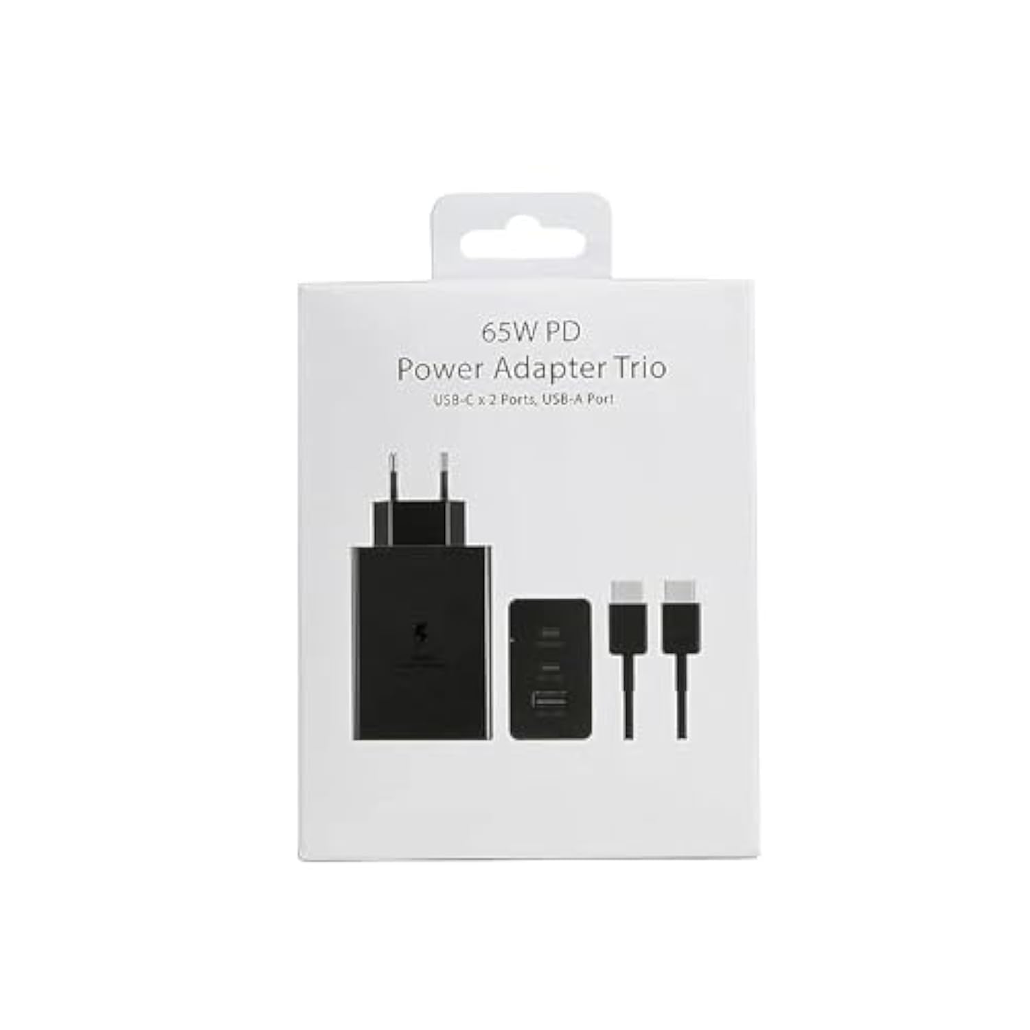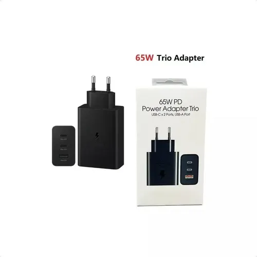 Este cargador de carga súper rápida cuenta con una potencia máxima de 65W y está diseñado para alimentar hasta tres dispositivos al mismo tiempo. Su estructura integra dos puertos USB-C y un puerto USB-A, distribuyendo la energía de forma inteligente según las necesidades de cada equipo conectado.